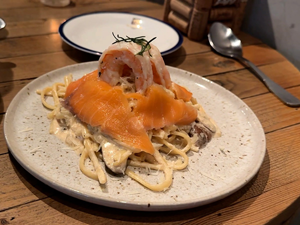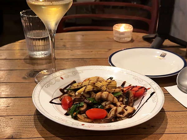 料理はいわゆるカフェ飯。中国語と英語のメニューがあって、なんとか注文。明太子パスタは間違い無いだろうと思って注文したが、とても美味しかった。きのこのスパイシー炒めはさすが台湾、なかなか辛かったがワインに合って良かった。