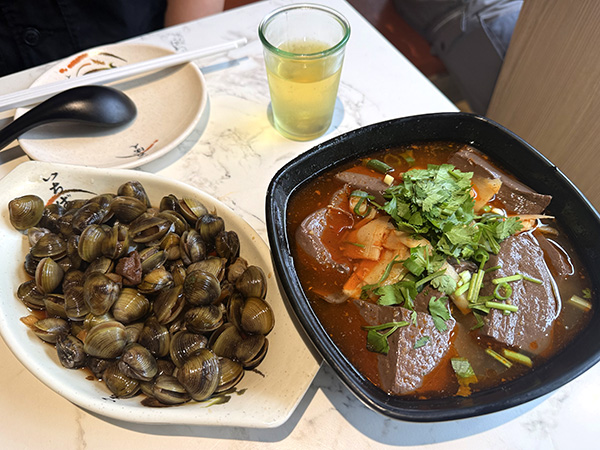 生のしじみを醤油漬けにした料理「鹹蜆」。これ、ニンニク臭くて最高!これがあれば永遠にビールが進んでしまう恐ろしく旨いつまみだ。友達が勧めてくれた「麻辣血」は、鴨の血を固めてスパイスで煮込んだもの。レバーより柔らかく、ふわっとしたような食感。この店でガチョウを絞めているのもあり、全く臭くない。