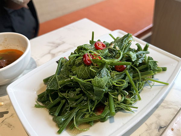 季節の青菜。これはその日によって野菜が変わるらしく今日は「龍鬚菜」という野菜だった。初めて食べる青菜でおいしかった〜。炒め加減も最高。