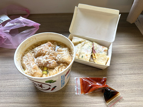 一番早く届けてくれそうな店を探して、鹹豆漿(豆乳スープ)と卵とハムのクレープを注文。