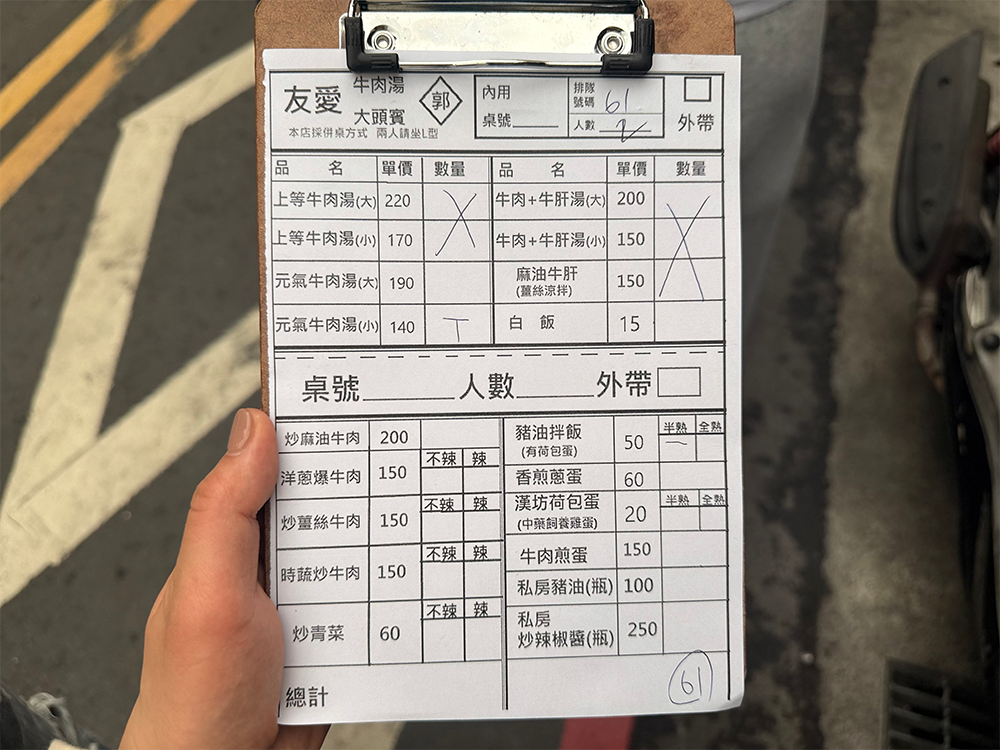 友人が連れて行ってくれた1軒目の牛肉湯。入口で注文票を取り、正の字で記入するスタイルだ。