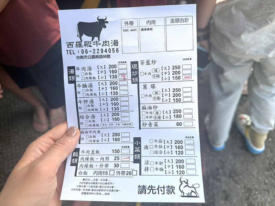 この店は朝6時から営業しており、私たちが到着した9時半の時点で「上等牛肉湯」と「牛肝湯」はすでに品切れ(注文票にはバツが付いてる)。