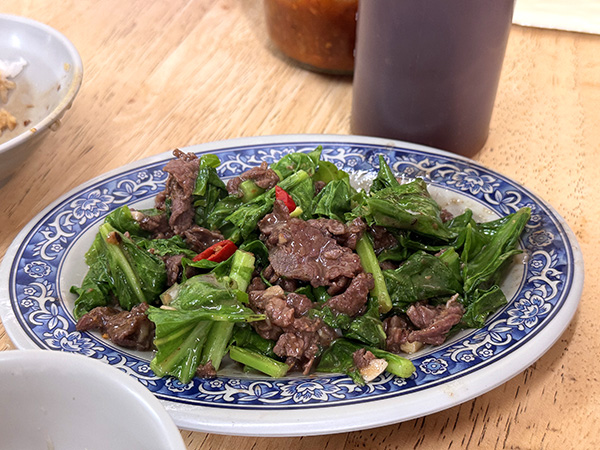 そして、友人が勧めてくれた芥藍炒(カイランチャオ)。今回の旅で、この牛肉と青菜の炒め物がすっかり気に入った。